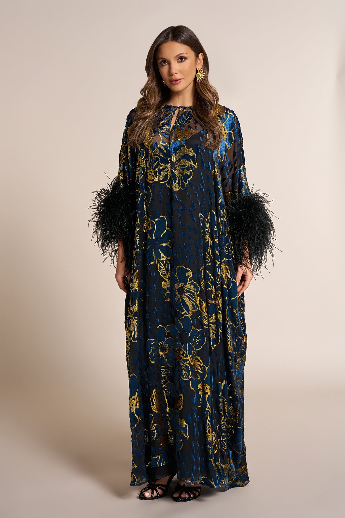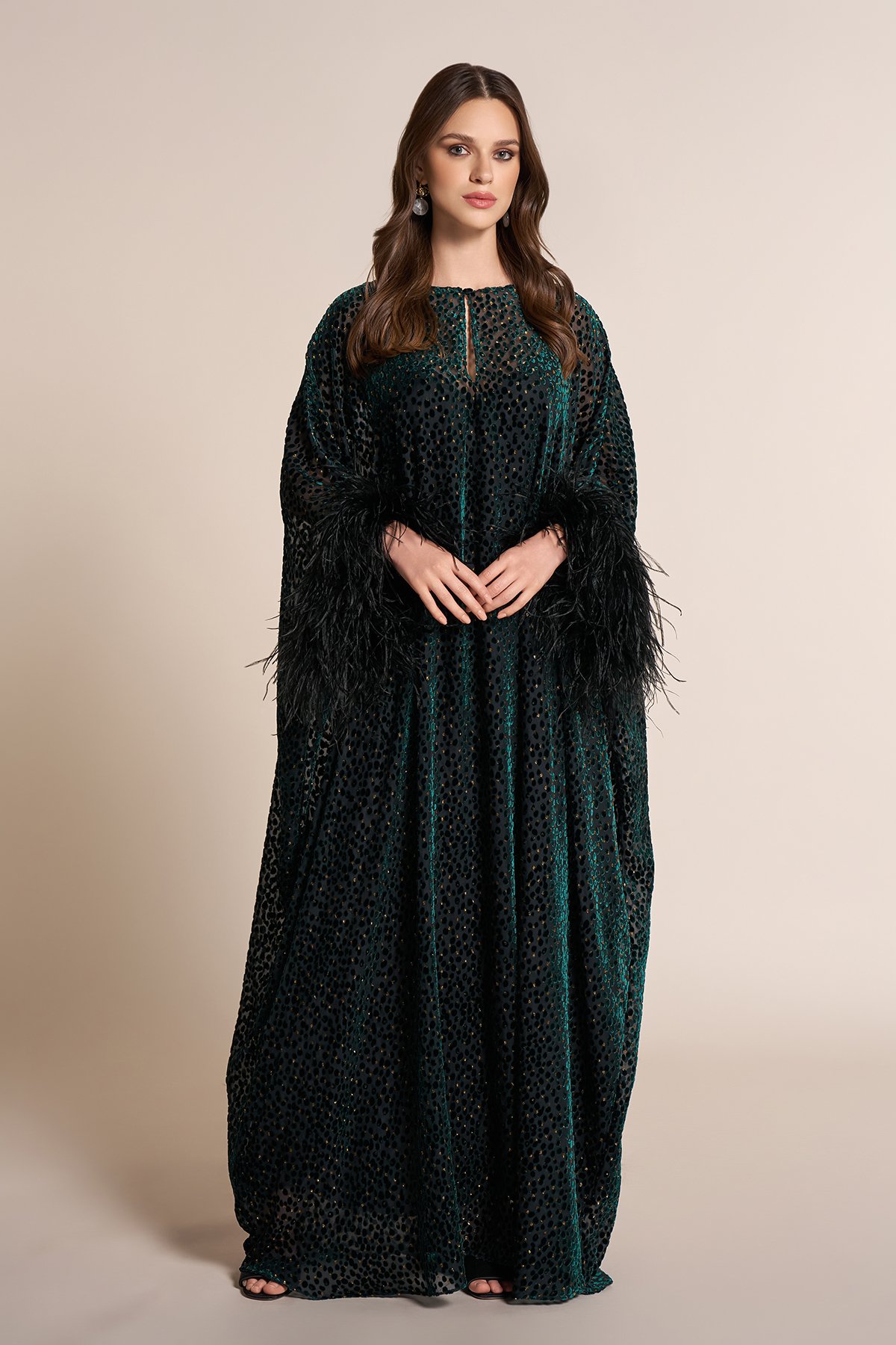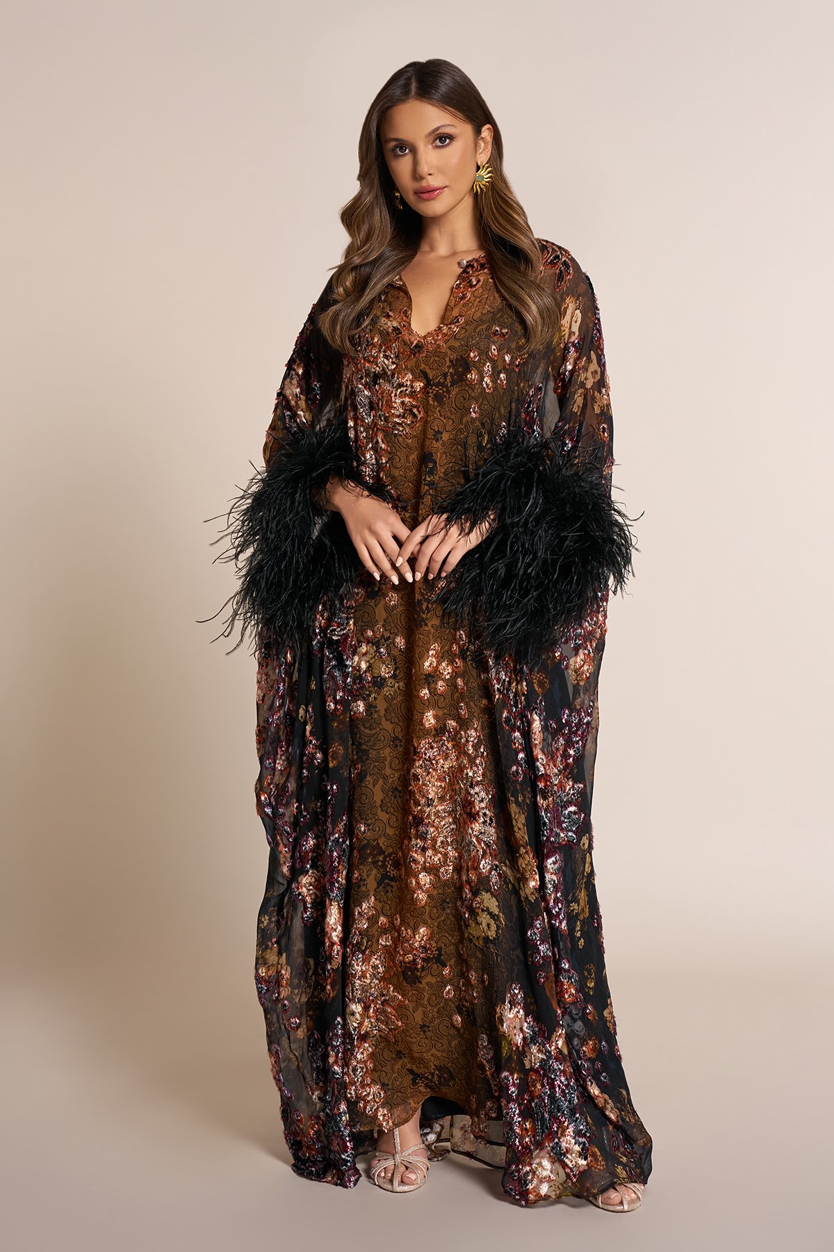 Chiffon qaftan with feathered sleeves