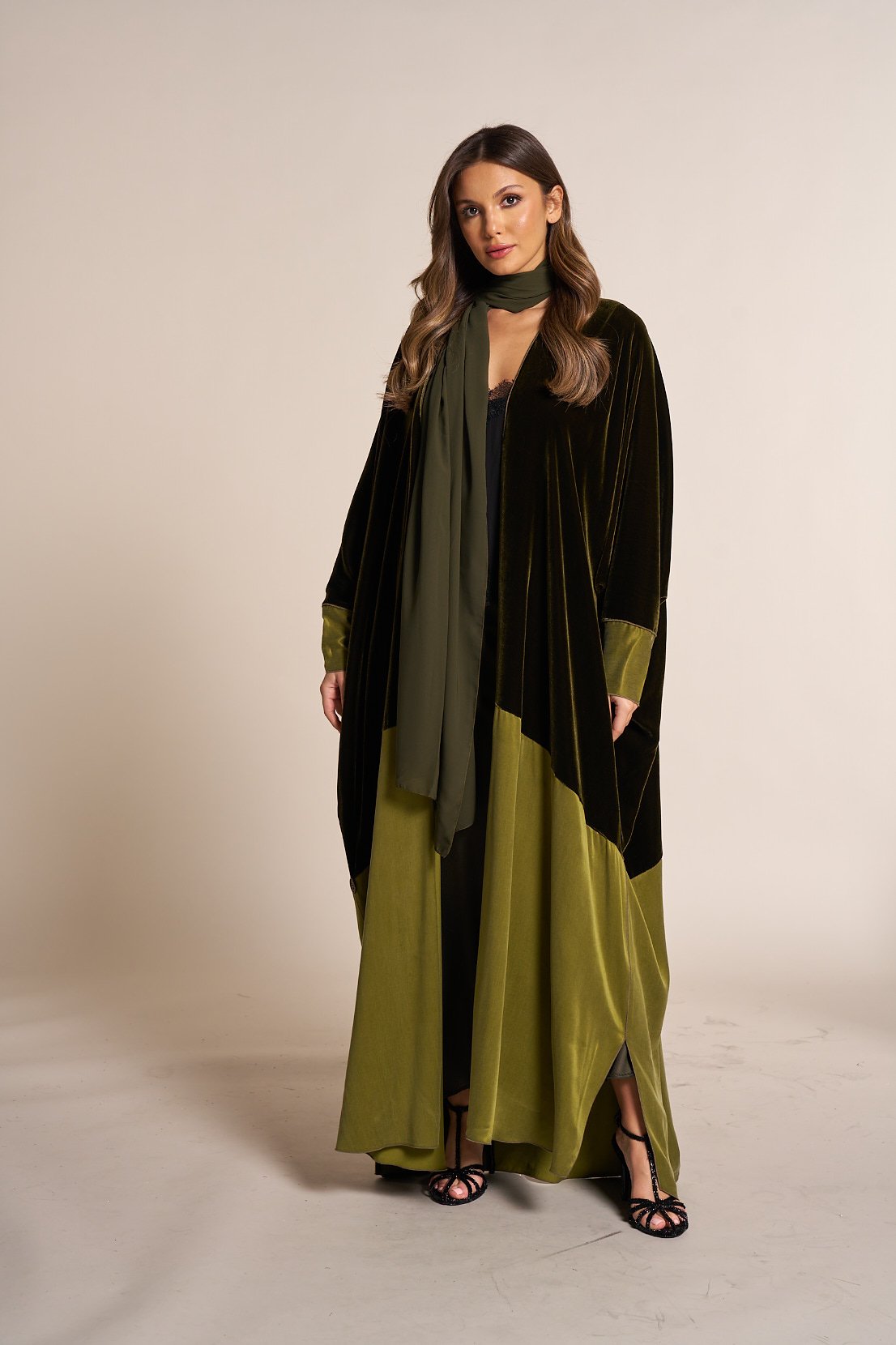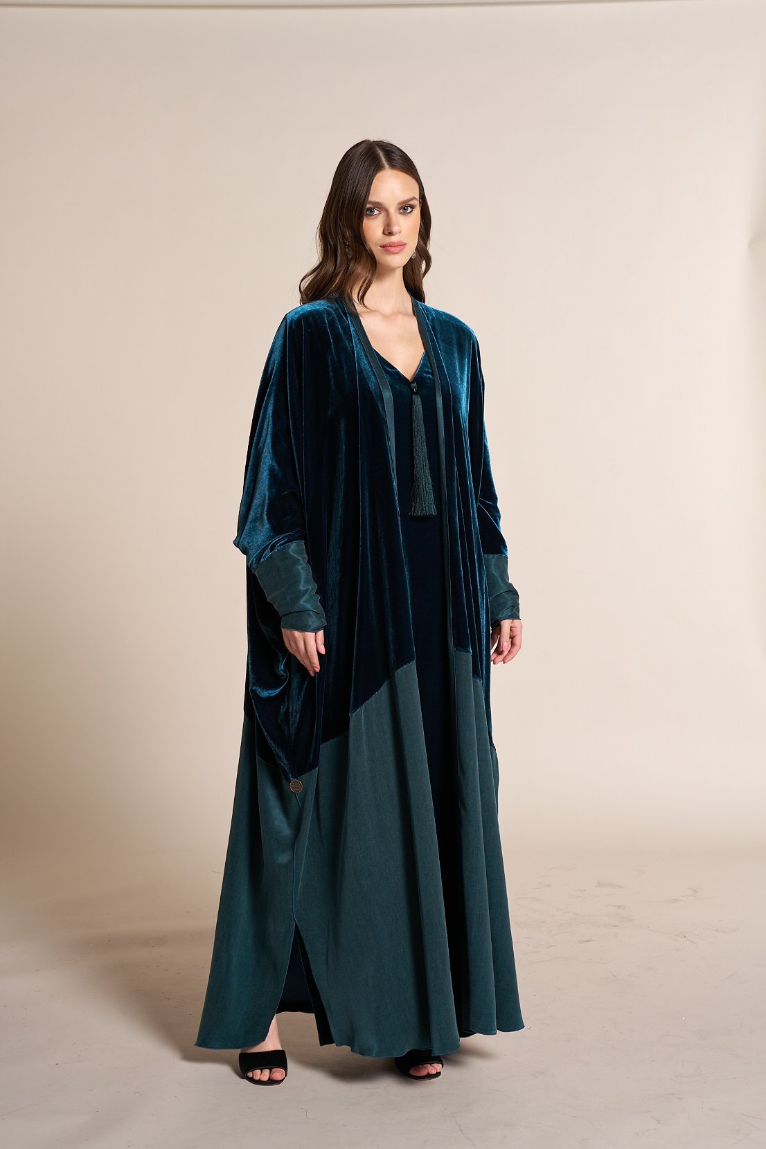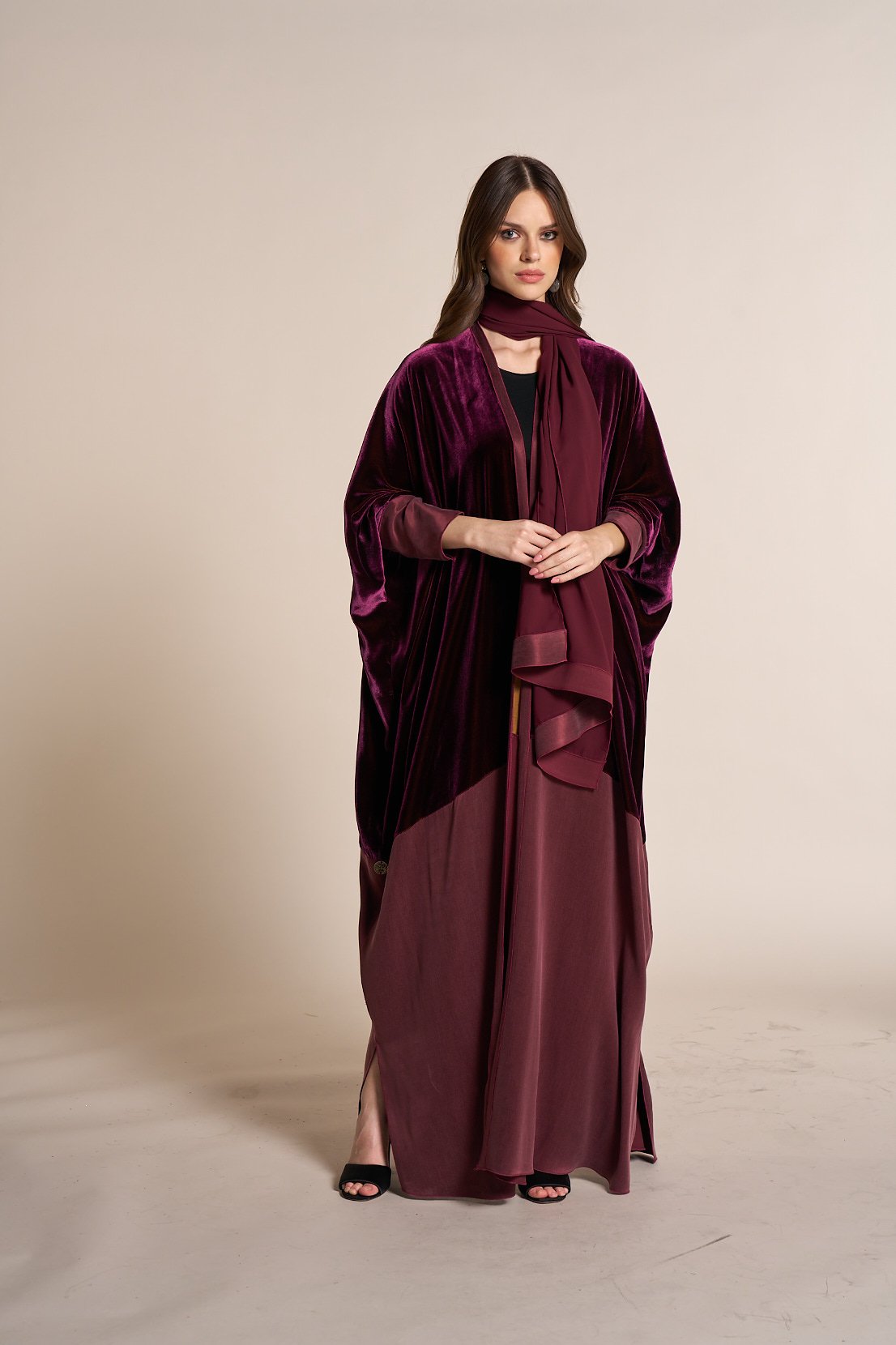 Velvet jalabia featuring wide sleeves , a V-neck cut and subtle back embroidery