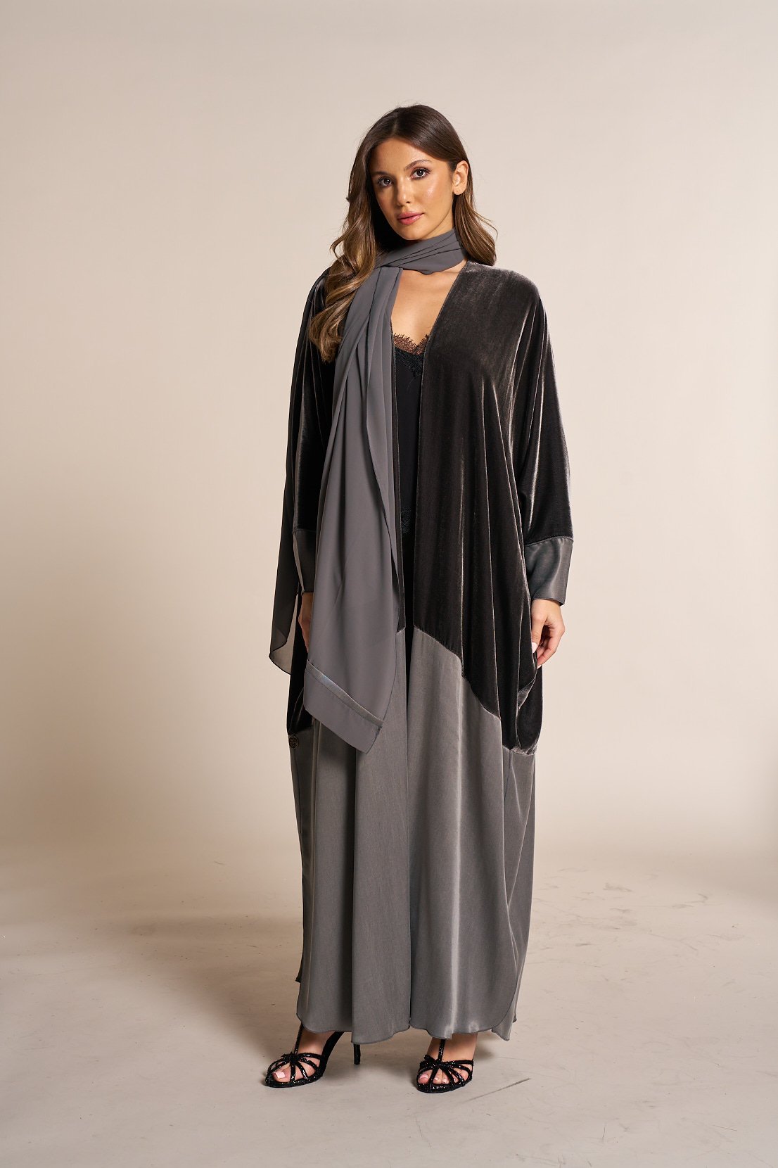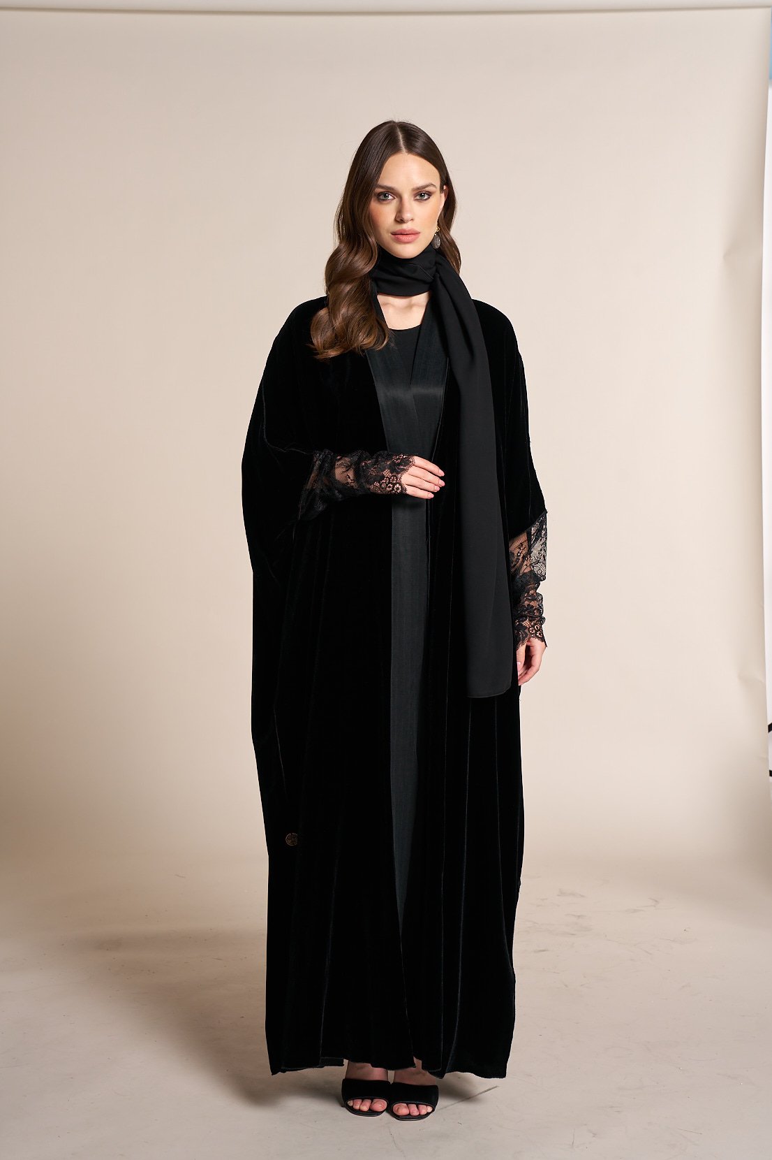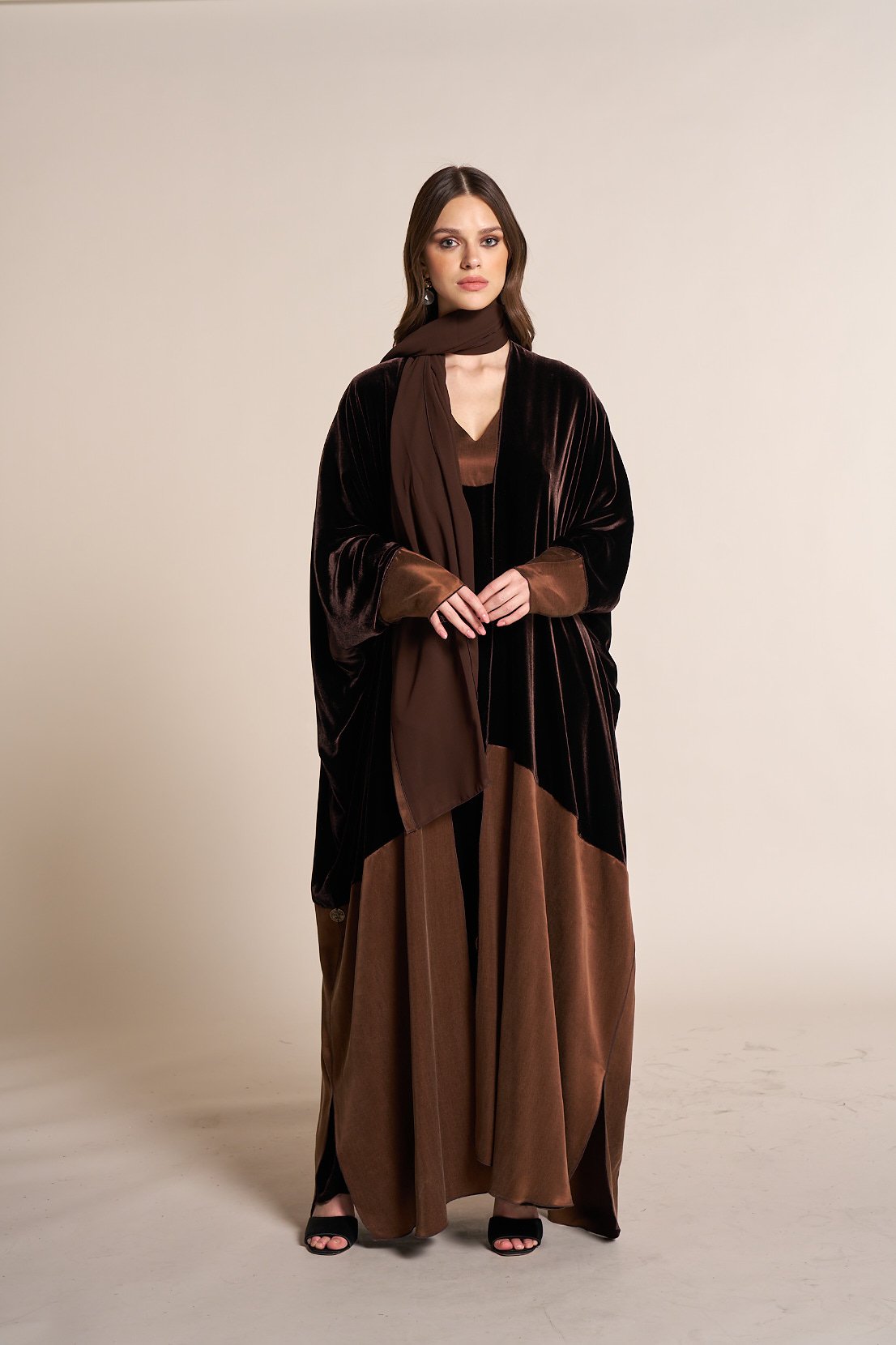 Velvet jalabia featuring wide sleeves , a V-neck cut and subtle back embroidery