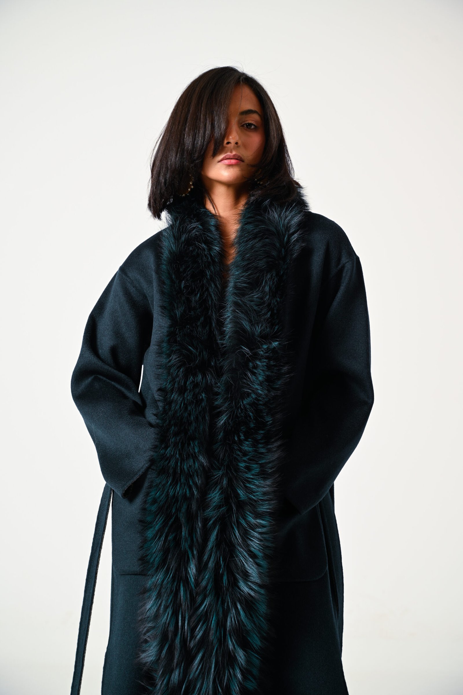 Crafted from the finest 100% cashmere, this double-face coat exudes sophistication and warmth, complemented by luxurious fox fur accents. The double-face construction enhances both comfort and durability, making it perfect for any occasion, from elegant evenings to daytime outings. Unique, classy, and undeniably fashionable, this coat combines refined design with premium materials to create a statement piece that’s as functional as it is stylish. A must-have for those who embrace luxury with grace.