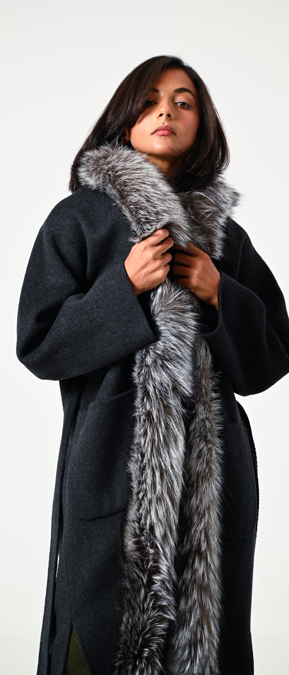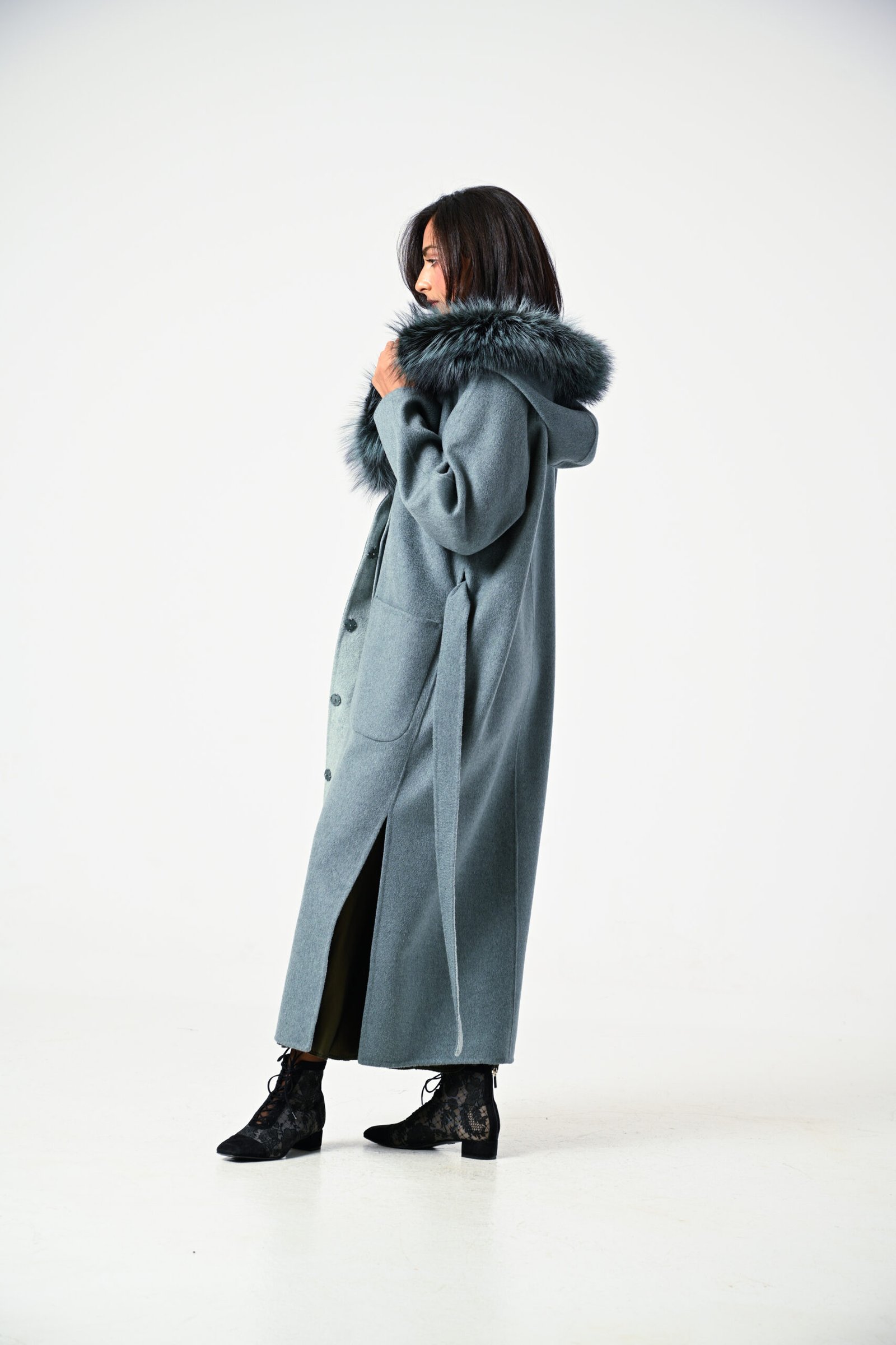 Indulge in timeless elegance with this 100% cashmere double-face coat, featuring luxurious fox fur accents and a chic hoodie. The premium cashmere fabric delivers unparalleled warmth and softness, while the double-face design ensures a sleek, refined finish. Perfect for both casual outings and formal occasions, this unique, classy, and fashionable coat combines comfort and style effortlessly. Elevate your wardrobe with this luxurious statement piece that exudes sophistication and charm.