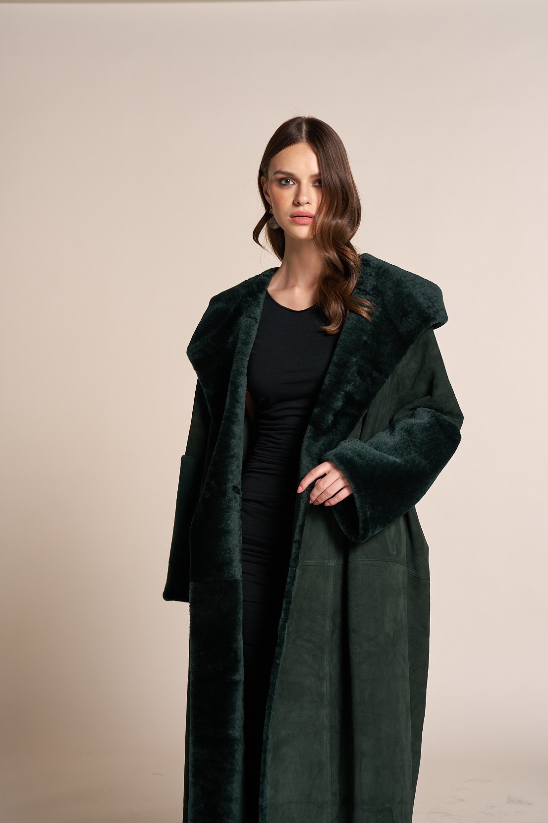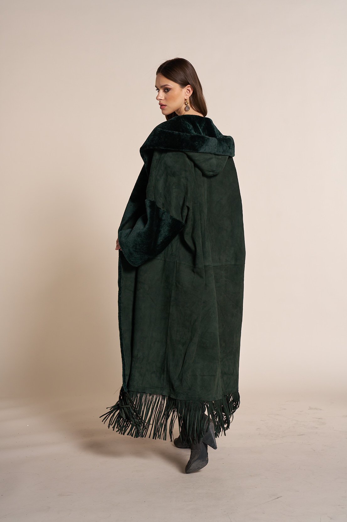 Fringe suede hoodie coat with astragan fur trim quantity