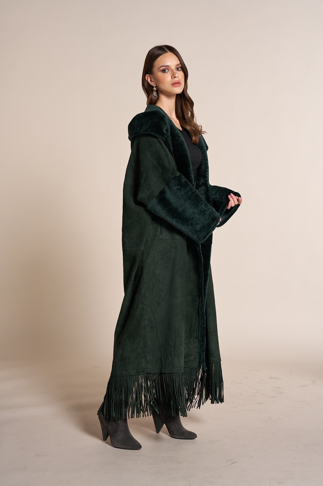 Fringe suede hoodie coat with astragan fur trim