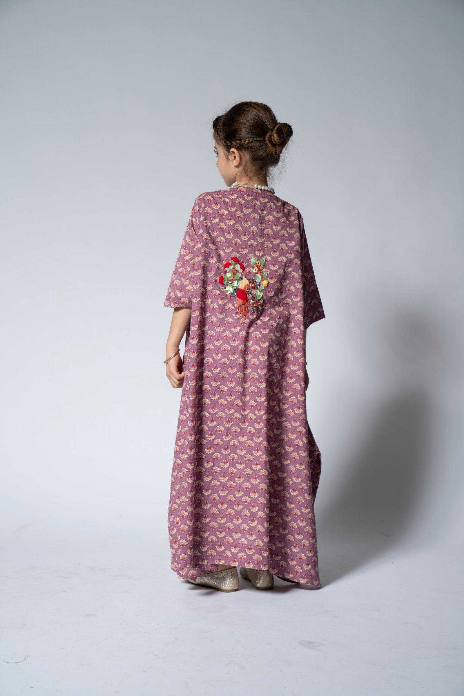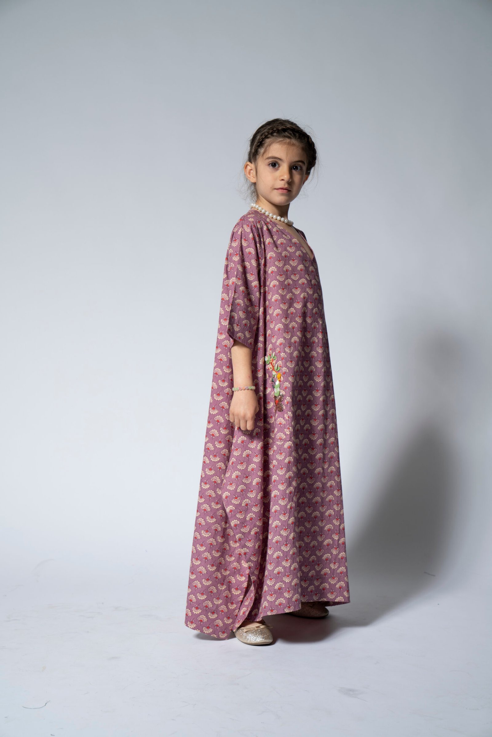 Stylish Girls’ Jalabiya with Printed Fabric and Back Embroider. A graceful blend of charm and elegance.