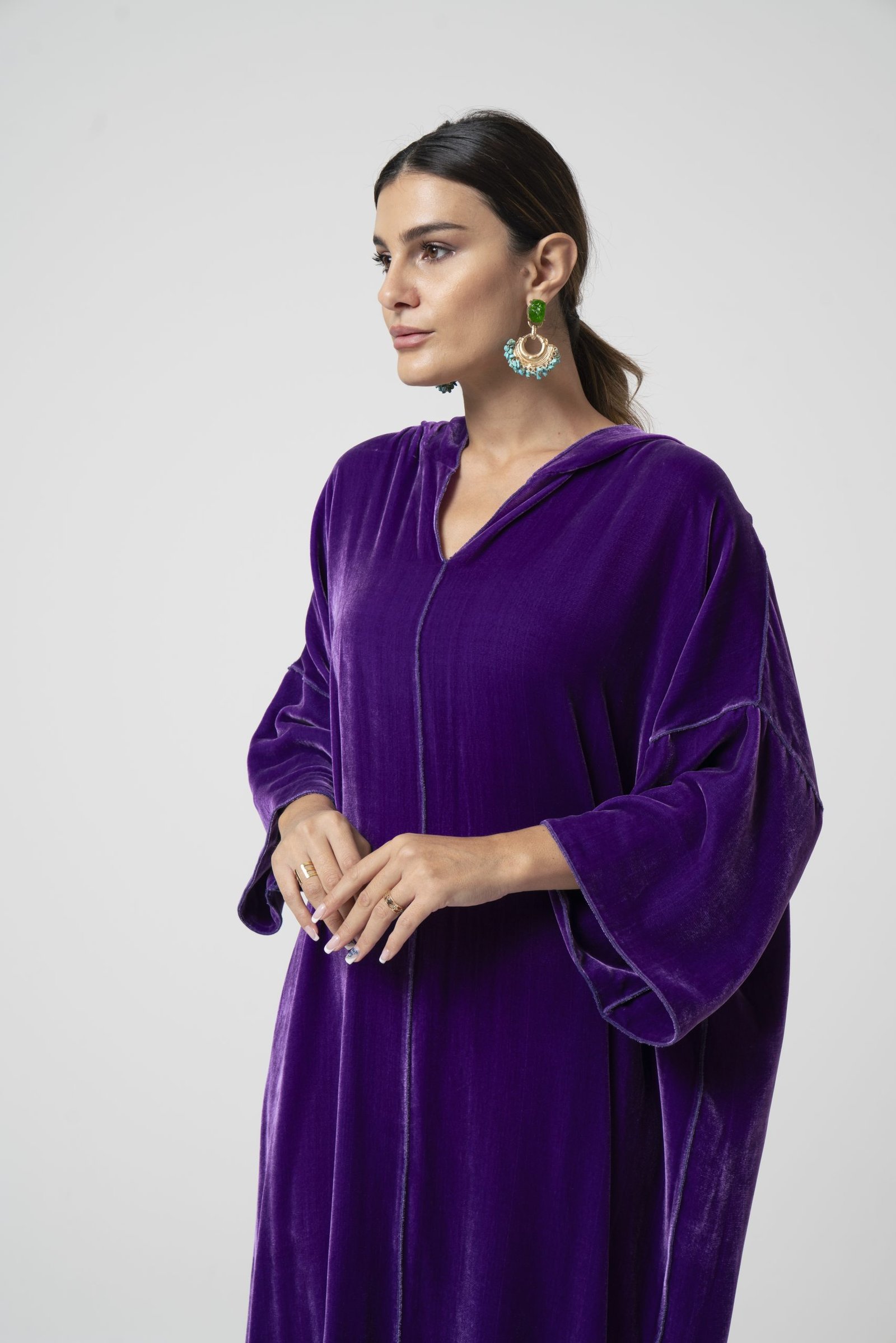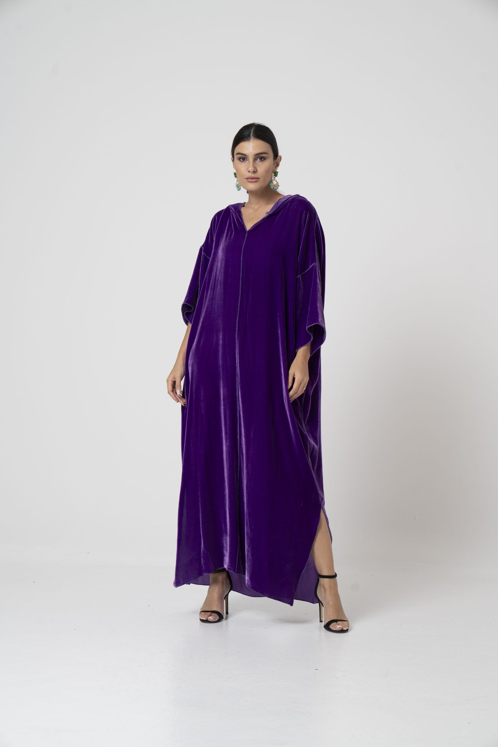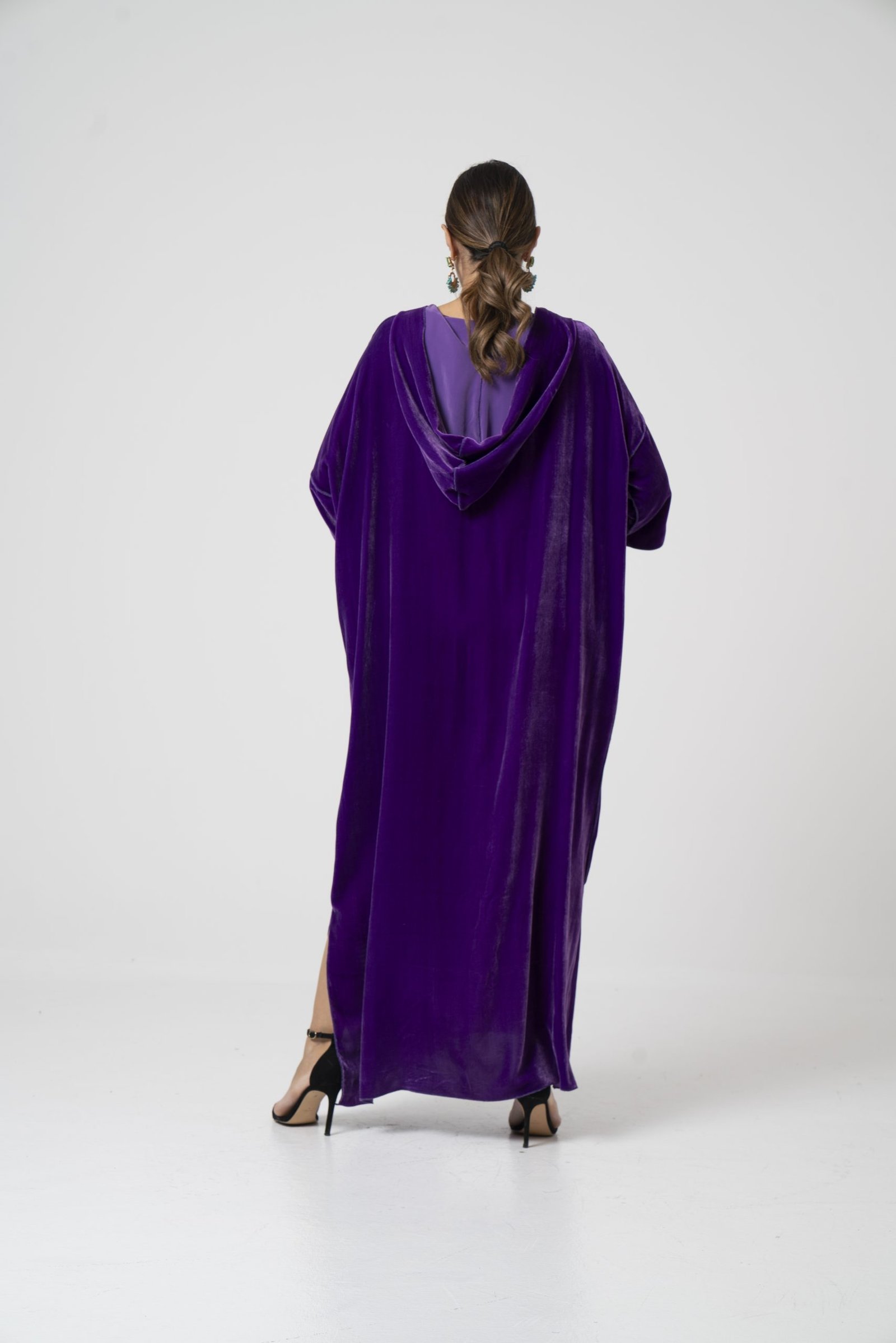 This purple velvet jalabiya offers an innovative take on classic attire, featuring a comfortable hood that adds a casual yet chic twist. The lush velvet fabric drapes beautifully, creating a silhouette that’s both relaxed and regal. The deep purple shade is versatile and striking, suitable for a variety of occasions from a relaxed evening at home to a festive gathering. Embrace a blend of luxury, comfort, and distinctive style with this unique hooded jalabiya.