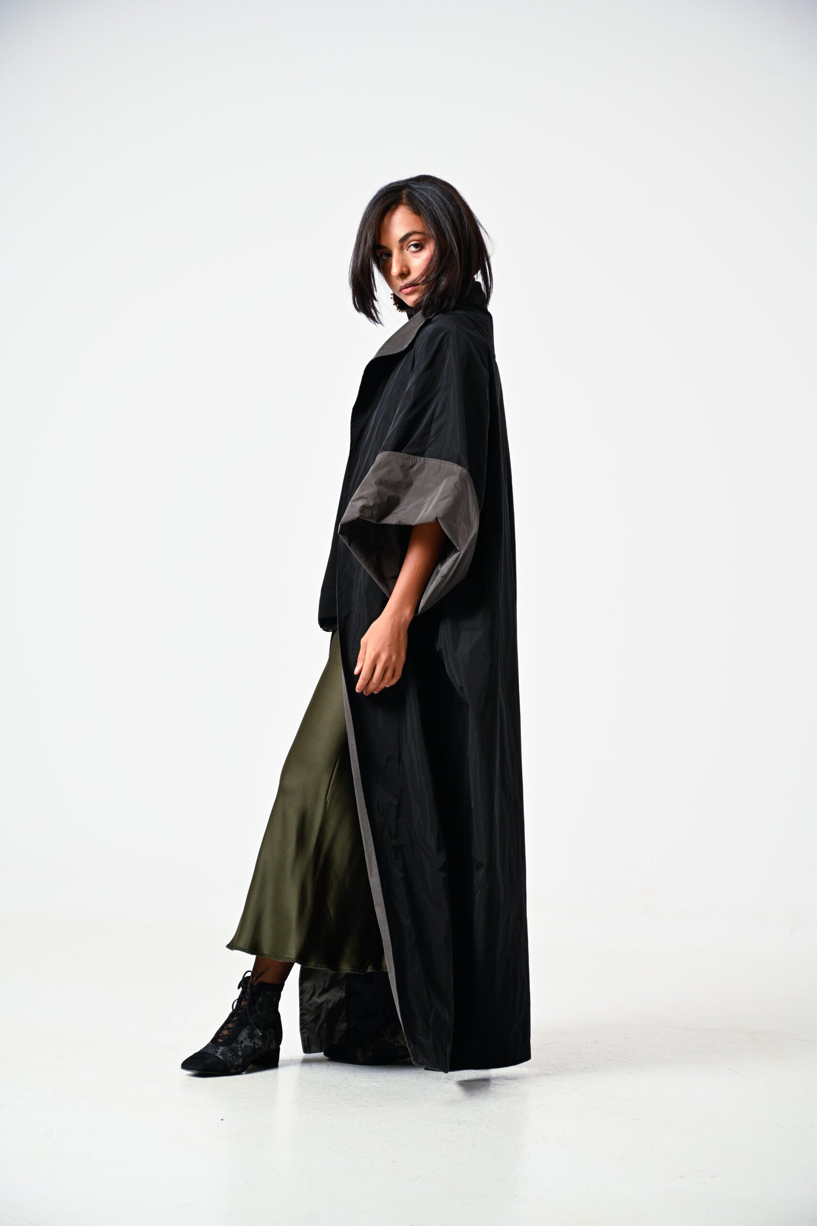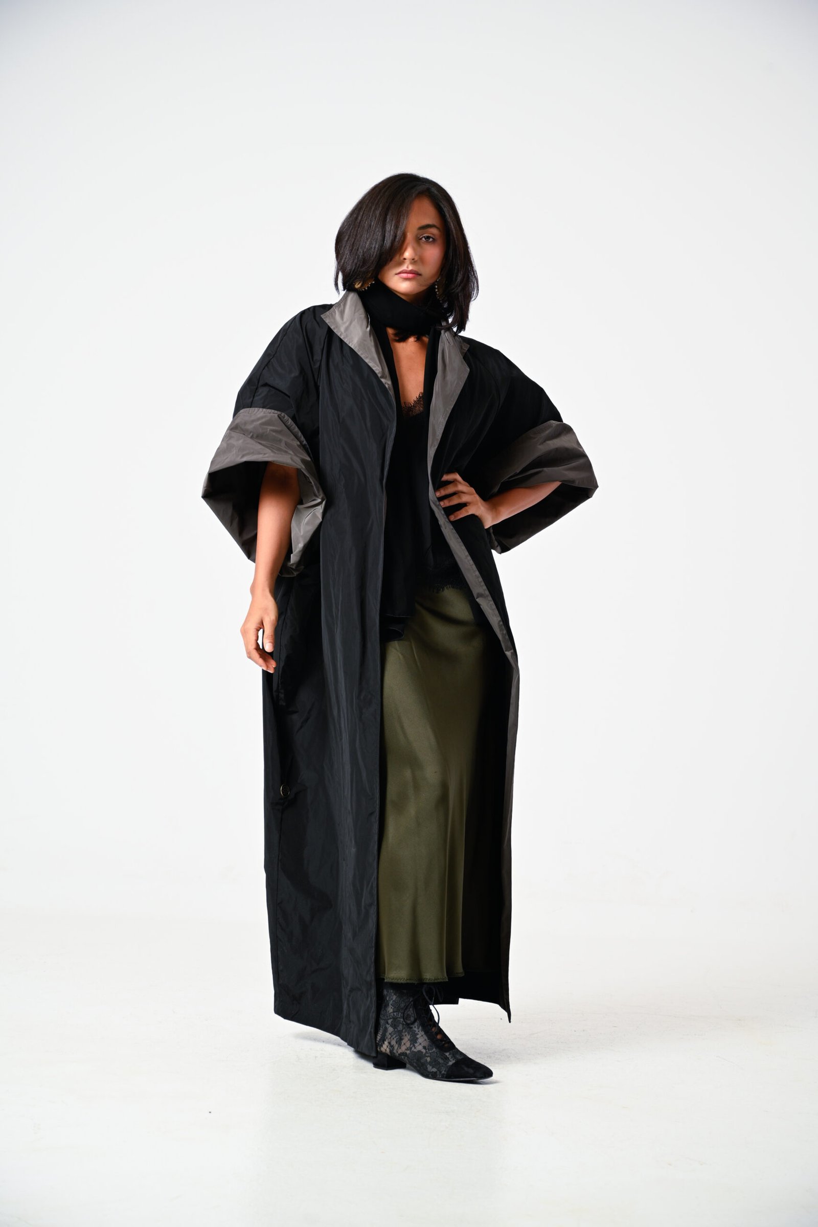 Elegant Black Tafta Rain Coat Abaya. Where functionality meets timeless style.