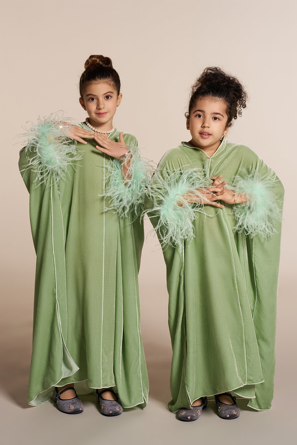Velvet jalabia with feathers